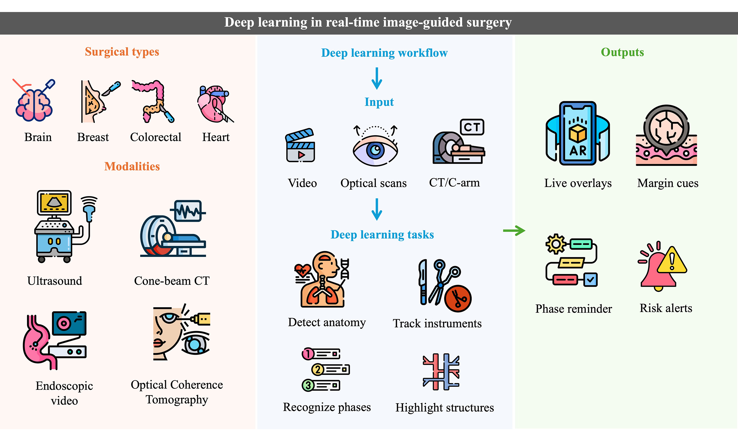 Surgery remains a cornerstone of modern healthcare, with approximately 313 million operations performed worldwide each year; paradoxically, only 6% of these are performed in the world’s poorest nations[1]. Postoperative mortality is now recognized as a major global health burden, with an estimated 4.2 million deaths within 30 days of surgery each year, accounting for 7.7% of all deaths[2]. Real-time image guidance has been shown to mitigate intraoperative errors; for instance, three-dimensional (3-D) imaging prompts a revision of surgical plans in roughly 20% of orthopedic cases[3], while augmented-reality overlays improve spatial orientation and usability in laparoscopic liver surgery[4]. Deep learning (DL) has accelerated these advances in recent years. High-resolution optical coherence tomography (OCT) has > 90% sensitivity and specificity for breast-margin assessment[5], and stimulated Raman histology matched board-certified pathologists with 94.6% diagnostic accuracy in a multicenter randomized trial[6]. In workflow analytics, DL models now recognize surgical phases with > 90% accuracy across millions of laparoscopic frames[7,8]. Regulatory activity mirrors this momentum: the United States Food and Drug Administration (FDA) has authorized more than 690 artificial intelligence (AI)/machine learning (ML)-enabled medical devices to date, although most target preoperative or diagnostic imaging rather than intraoperative support[9]. However, translating these capabilities into routine operating-room practice remains difficult: adoption typically requires high up-front capital expenditure (CAPEX) for operating room (OR)-grade imaging and computing, substantial staff training and credentialing, workflow redesign to meet real-time constraints, and organizational change management to overcome resistance; interoperability and data governance hurdles further slow integration[10,11].