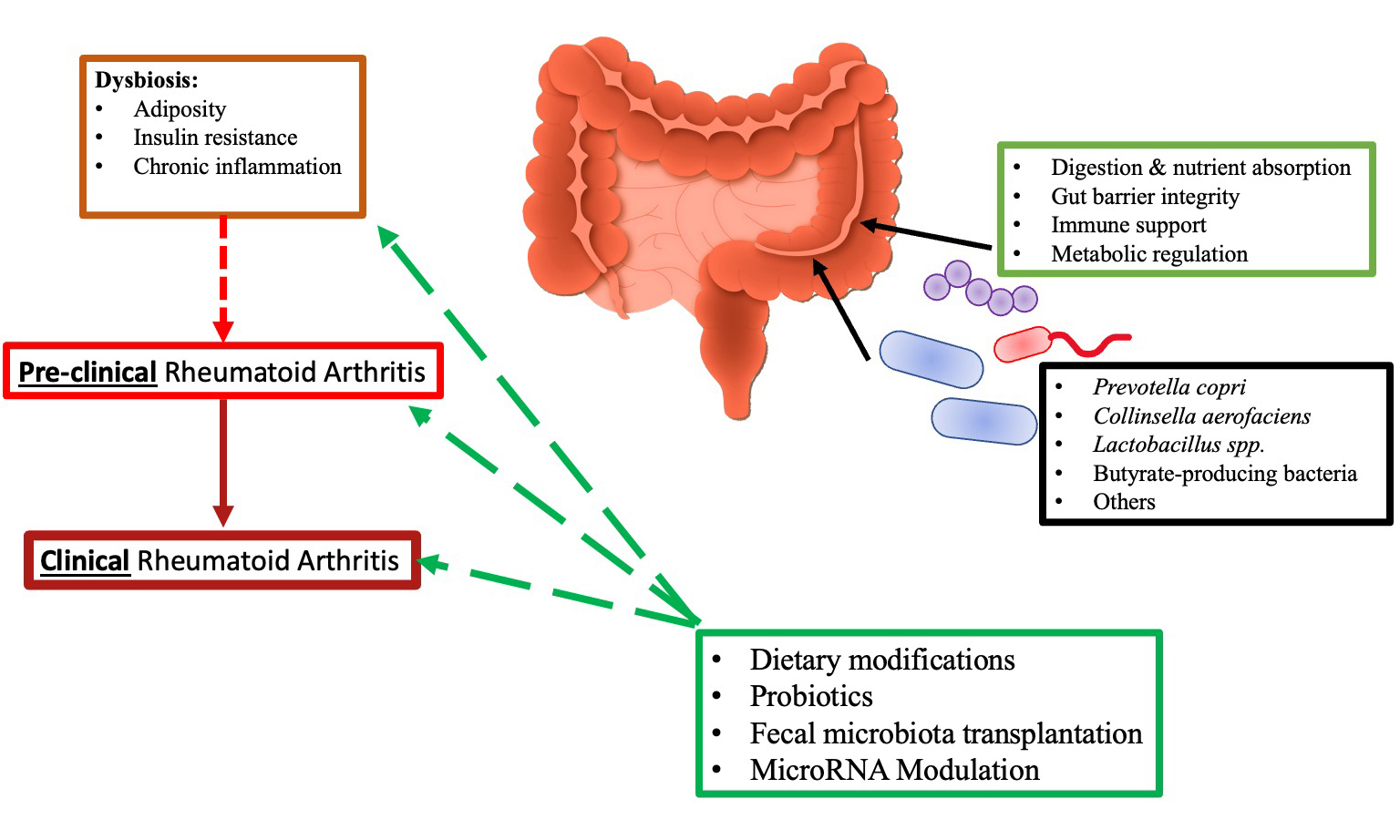 Research into specific microbial species such as P. copri and Collinsella, along with advancements in therapies such as FMT and autophagy modulation, presents exciting opportunities for intervention. Furthermore, investigating miRNA modulation offers valuable insights into the complex relationship between gut health and immune function. However, additional clinical studies are necessary to validate these strategies and assess their effectiveness in preclinical populations.